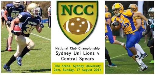 The 2014 National Club Championship Game will be played at the Arena, Sydney University, on Sunday, 17 August 2014, between the #1 ranked Sydney Uni Lions (NSW) and the #2 ranked Central Spears (ACT).