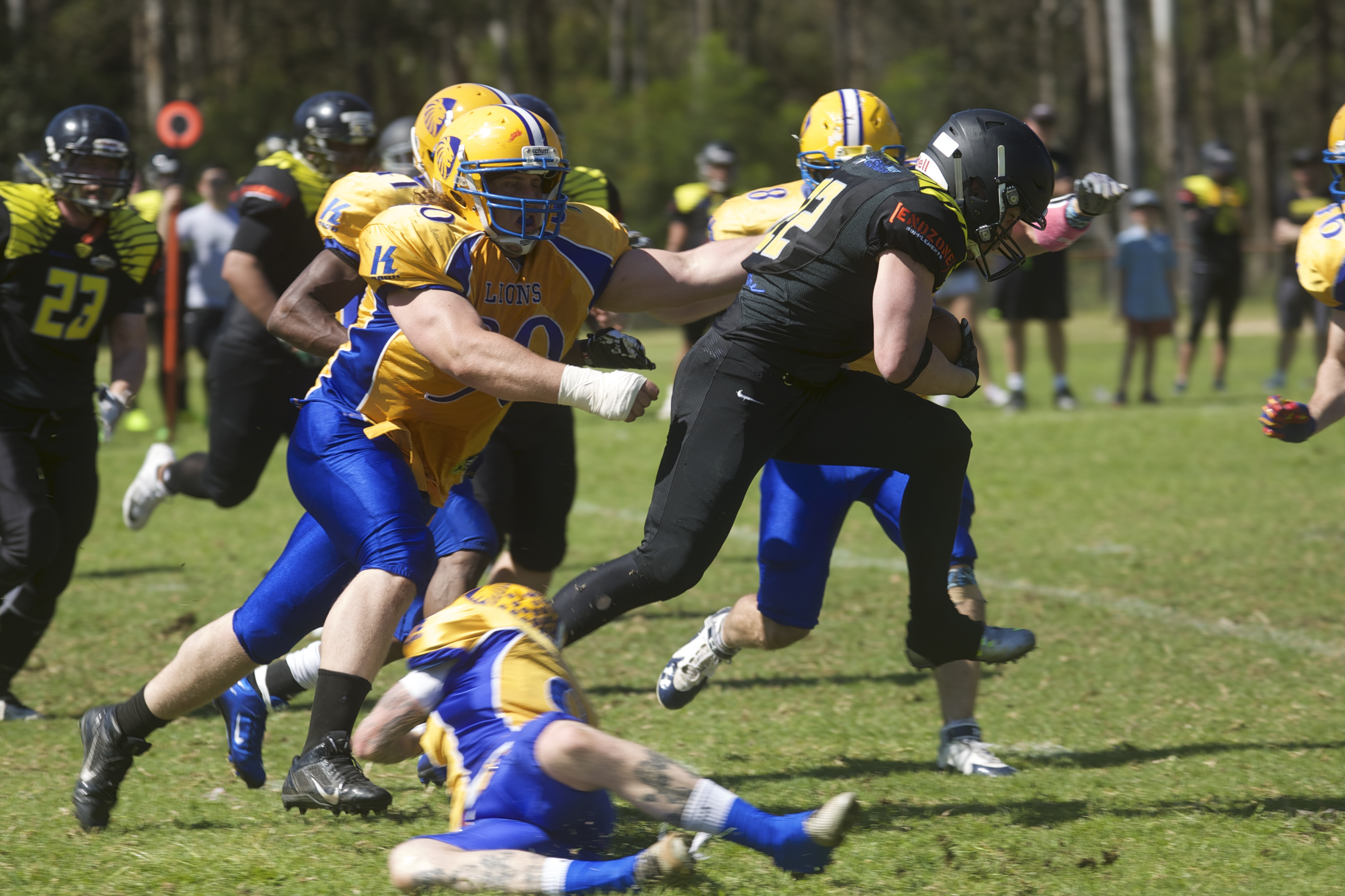The Sydney Uni Lions continued their strong start to the season today with a 56-0 victory over the Nepean Ducks. Defensive Lineman Devin Lagorio (pictured) set the tone right from the first play as the Lions D put on another ferocious display.