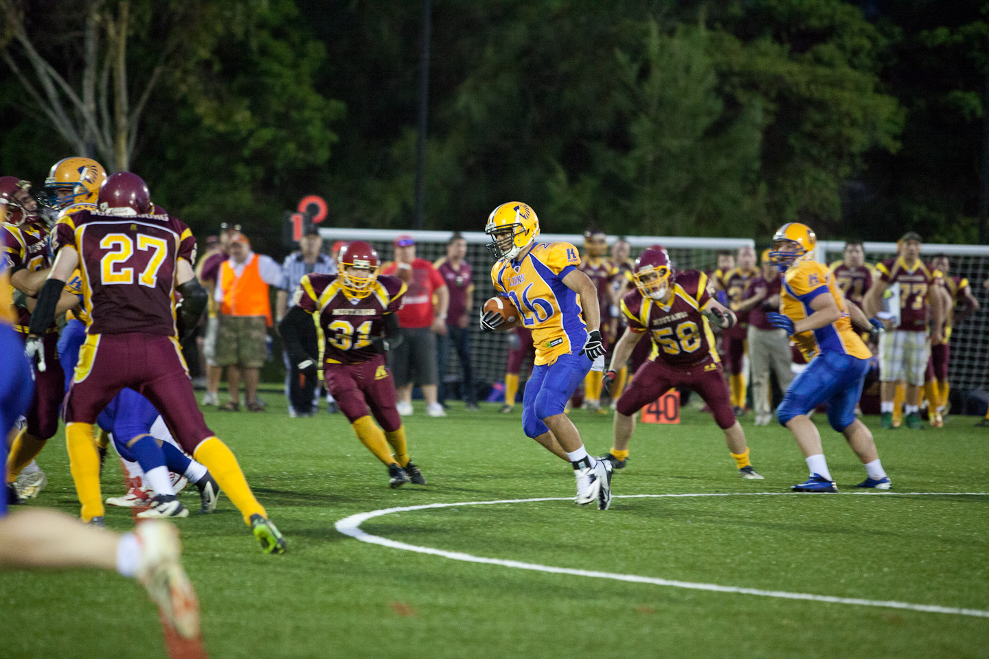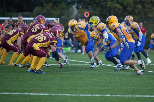 In what could best be described as perfect football conditions, the Mustangs took the opening kickoff and their high powered offence was quickly subdued. From there, the Lions scored two plays later, with Alex Watson running the length of the field to score. This would be the theme for the first half: Lions D would halt a Mustang’s drive, and a handful of plays later the Lions O would punch it in.