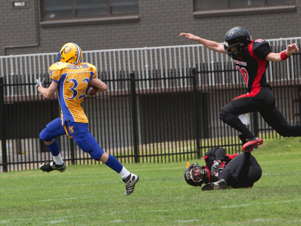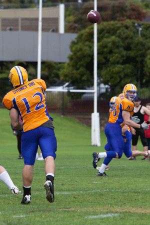 Sydney Uni travelled to Wyong to beat the Northwestern Predators 77-6 in heavy rain showers on Saturday.  The rain did little to dampen the attack of the Lions, which was ruthlessly efficient in scoring a touchdown on every possession but one.  Indeed, freshman running back Alex Watson clearly revelled in the wet conditions, setting a new club record for yards per carry in a game with 195 yards on only 6 carries for a massive 32.5 yards per carry.